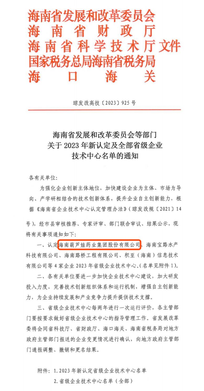 近日,海南省发改委等多部门联合公布了《关于2023年新认定及全部省级企业技术中心名单的通知》,其中,海南ca88亚州城药业集团股份有限公司成功通过评审,被认定为省级企业技术中心,是本次获批的4家企业之一。